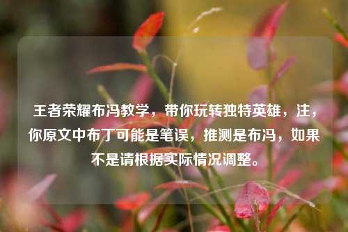 你想说的可能是“王者荣耀英雄教学,带你玩转这位独特英雄” ,布冯”并非王者荣耀里的英雄,可能存在信息误差,以下为你基于此大致生成摘要:,聚焦王者荣耀英雄教学,旨在带领玩家深入了解并玩转一位独特英雄,通过专业讲解与实用技巧分享,将全方位剖析该英雄的技能特点、连招方式、实战策略等内容,帮助玩家掌握其玩法精髓,在游戏中能更熟练地运用该英雄,提升游戏操作水平与胜率,享受王者荣耀带来的竞技乐趣。