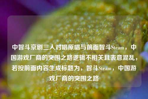 似乎存在表述混淆且信息不完整,前面提到“智斗Steam,中国游戏厂商的突围之路”,能推测是关于中国游戏厂商如何在Steam平台等市场环境中寻求突破的话题,但后面“智斗京剧三人对唱原唱”与前面内容关联性不明,若仅围绕“智斗Steam,中国游戏厂商的突围之路”,摘要可表述为:当前中国游戏厂商面临Steam等国际游戏平台的竞争压力,如何突出重围成为关键,这可能涉及打造具有中国特色的优质游戏、优化营销策略、提升玩家体验等方面,探索出一条适合自身发展的道路,以在国际游戏市场站稳脚跟,提升中国游戏的影响力。