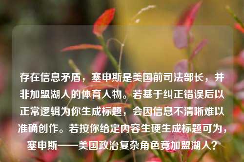 存在信息混淆,塞申斯一般指杰夫·塞申斯,他是美国政治人物,并非加盟湖人的体育相关角色,以下是基于正确信息为你生成的摘要:杰夫·塞申斯是美国政治舞台上一位复杂的角色,他在政治生涯中扮演诸多重要角色,曾担任联邦检察官、阿拉巴马州联邦参议员等职,在特朗普执政时期,他出任美国司法部长,其任职期间的一些举措和立场引发广泛争议,在***政策、司法改革等诸多方面都有着独特且影响深远的表现,是美国政坛不可忽视的人物。