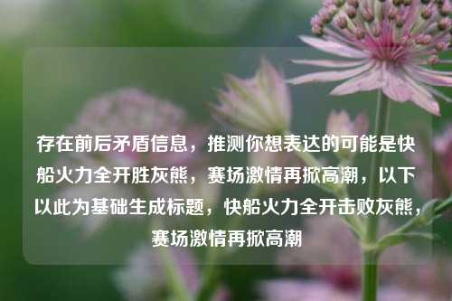 存在前后矛盾表述,推测是快船胜灰熊这一情况,摘要如下:,赛场上***再掀***,快船火力全开,在与灰熊的比赛中展现出强大实力,球队全员积极作战,进攻端多点开花,防守端也密不透风,成功限制了灰熊的发挥,快船凭借高效的得分表现和出色的团队协作,最终战胜灰熊,这场比赛让球迷们大饱眼福,也进一步提升了快船在赛事中的竞争力与士气。